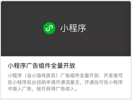 早在七月中旬,微信小程序(邯鄲小程序開(kāi)發(fā))官方已宣布,小程序的廣告組件已全量開(kāi)放,開(kāi)發(fā)者可以在后臺申請開(kāi)通流量主,在小程序接入廣告,按月獲得廣告收入。