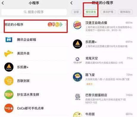 2017年8月,微信官方發(fā)布關(guān)于小程序能力重要升級的消息:為提升用戶(hù)使用效率,「附近的小程序」新增餐飲類(lèi)目篩選。也就是說(shuō)符合此類(lèi)目條件的小程序,除了出現在“全部”中,也會(huì )在“餐飲美食”里呈現。