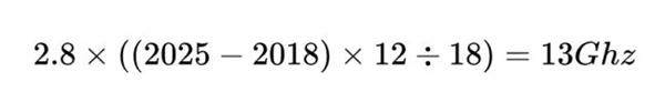 但假設我們使用了黑科技提升主頻。等到了 2025 摩爾定律失效時(shí),我們的手機 CPU 主頻應該達到: