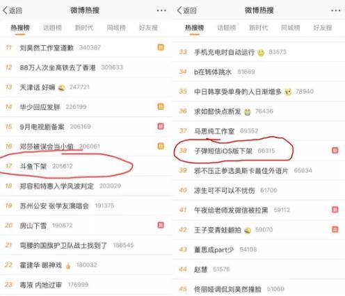 做內容的斗魚(yú)和做社交的子彈短信,在同一天登上了微博熱搜,竟然都是因為下架。