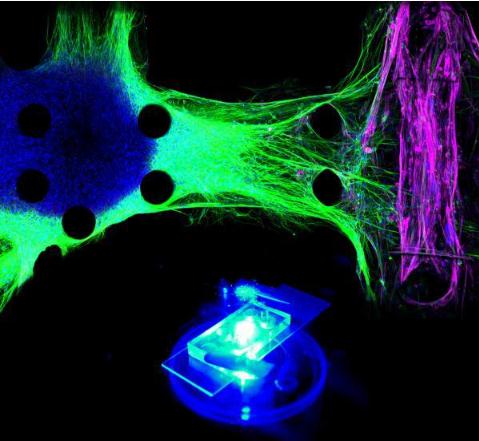這些神經(jīng)元用光遺傳技術(shù)編輯過(guò),能在光照控制下刺激肌肉收縮。通過(guò)觀(guān)察兩個(gè)柔性柱子的位移情況,研究人員就能測量肌肉收縮的力度。