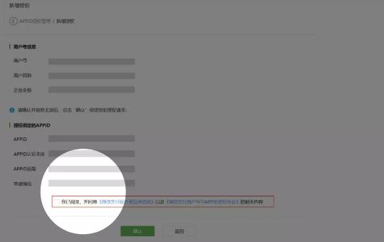 2. 填寫(xiě)相關(guān)已認證APPID信息,在最下方閱讀及簽署《微信支付聯(lián)合運營(yíng)承諾函》和《微信支付商戶(hù)號與APPID授權協(xié)議》,點(diǎn)擊“確認”提交,發(fā)起授權申請;