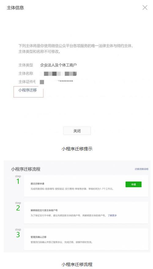在小程序主體遷移功能開(kāi)放之前,如果小程序主體有遷移需求,只能重新在新主體下再做一個(gè)小程序,然后通過(guò)在原有小程序上添加引導鏈接,引導用戶(hù)訪(fǎng)問(wèn)新主體下的小程序。這種做法不僅麻煩,也過(guò)于笨重。更嚴重的問(wèn)題是用戶(hù)流失。流失主要體現在兩個(gè)方面。我們都知道小程序無(wú)需關(guān)注,但也會(huì )有用戶(hù)留存。用戶(hù)訪(fǎng)問(wèn)小程序,可以添加到我的小程序里,并出現在微信聊天主頁(yè)頂部的下拉菜單里。重新在新主體生成小程序后,老用戶(hù)訪(fǎng)問(wèn)舊主體小程序,如果沒(méi)有注意到引導信息,或者覺(jué)得麻煩沒(méi)有點(diǎn)擊訪(fǎng)問(wèn),這就帶來(lái)了用戶(hù)流失。另一方面,小程序下都會(huì )對應用戶(hù)的Union ID,如果生成新主體,沒(méi)有保存便注銷(xiāo)了舊主體的小程序,原有小程序里的賬號、積分等用戶(hù)數據便會(huì )丟失,損失慘重。而且小程序具有名稱(chēng)唯一性,想在新主體下重新注冊,便要先注銷(xiāo)舊主體小程序,這個(gè)時(shí)間空檔也還存在名稱(chēng)被搶注的風(fēng)險。