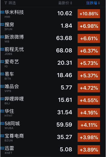 中國概念股多數上漲,其中漲幅較大的公司包括:華米科技(漲 10.86%)、搜房(漲 6.98%)、新浪微博(漲 6.61%)、前程無(wú)憂(yōu)(漲 6.37%)、愛(ài)奇藝(漲 5.73%)、易車(chē)(漲 5.37%)、唯品會(huì )(漲 4.72%)、嗶哩嗶哩(漲 4.55%)、華住(漲 4.16%)、58 同城(漲 4.11%)、寶尊電商(漲 3.98%)、迅雷(漲 3.89%)、歡聚時(shí)代(漲 3.61%)、新浪(漲 3.47%)、陌陌(漲 3.29%)、汽車(chē)之家(漲 3.29%)、團車(chē)網(wǎng)(漲 3.21%)、瑞思教育(漲 3.18%)。