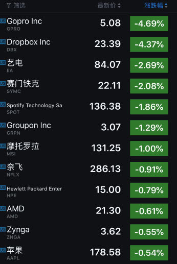 另一方面,跌幅較大的公司包括:Gopro(跌 4.69%)、Dropbox(跌 4.37%)、藝電(跌 2.69%)、賽門(mén)鐵克(跌 2.08%)、Spotify(跌 1.86%)、Groupon(跌 1.29%)、魔頭羅拉系統(跌 1.00%)。