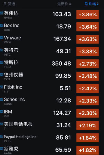 美國科技股多數上漲,其中漲幅較大的公司包括:英偉達(漲 3.86%)、Box(漲 3.64%)、VMware(漲 3.63%)、英特爾(漲 3.38%)、特斯拉(漲 2.73%)、德州儀器(漲 2.48%)、Fitbit(漲 2.42%)、Sonos(漲 2.33%)、IBM(漲 2.30%)、AT&T(漲 2.19%)。