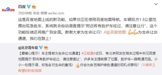 近日,有北京網(wǎng)友在駕車(chē)過(guò)程中聽(tīng)見(jiàn)百度地圖提示“即將有救護車(chē)經(jīng)過(guò),請注意避讓”,許多車(chē)主提前讓出了生命通道,救護車(chē)一路暢通無(wú)阻。一句提示語(yǔ),飽含對生命的重視,也被網(wǎng)友成為“最暖心提示”。