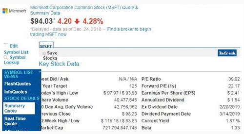 本周一美國股市收盤(pán)時(shí),微軟股價(jià)為 94.03 美元,較前一交易日 98.23 美元的收盤(pán)價(jià)下跌 4.2 美元,跌幅為 4.28%。按周一收盤(pán)時(shí)的價(jià)格計算,微軟市值為 7217.95 億美元,較上周五收盤(pán)時(shí)的 7540.35 億美元縮水 322.4 億美元。