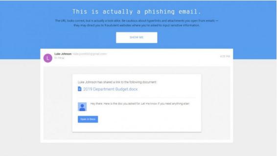 出現在每個(gè)項目中都是這種嘗試的跡象,但如果用戶(hù)不仔細觀(guān)察它們很容易被遺漏。在回答問(wèn)題后,用戶(hù)會(huì )看到解釋合法的郵件及網(wǎng)絡(luò )釣魚(yú)的例子,所以如果用戶(hù)在看到釣魚(yú)鏈接時(shí)不知道如何發(fā)現,這可能是學(xué)習的好方法。
