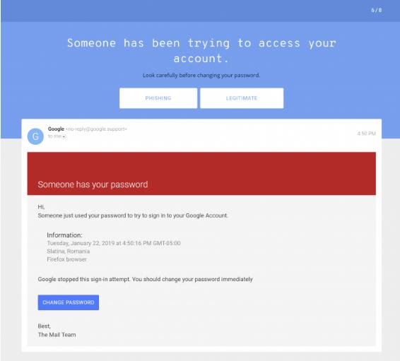 包含八個(gè)問(wèn)題的測驗首先要求用戶(hù)想出一個(gè)名字和一個(gè)電子郵件地址 - 無(wú)論是真實(shí)的還是假的 - 為其增添一絲真實(shí)感。完成后,用戶(hù)將接受一系列場(chǎng)景,向他們顯示各種電子郵件及其包含的鏈接。最終,用戶(hù)需要檢查消息,以尋找他們正在查看的可能是網(wǎng)絡(luò )釣魚(yú)嘗試的線(xiàn)索。