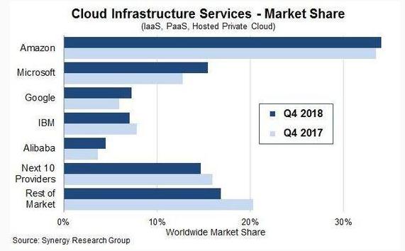 但是從市場(chǎng)份額來(lái)看,Google 并沒(méi)有取得亮眼的突破。從 Synergy Research Group 最新發(fā)布的 2018 Q4 全球云基礎設施服務(wù)市場(chǎng)(Iaas,Paas,托管私有云)份額來(lái)看,亞馬遜和微軟兩位頭部玩家各占據 34% 和 15% 的市場(chǎng)份額,Google 只分得 7%。2018 Q3,Google 排在 IBM 之后。在 IDC 日前公布的 2018 年上半年全球公有云 Iaas 市場(chǎng)份額數據,排名順序為亞馬遜、微軟、阿里云、IBM 和 Google。