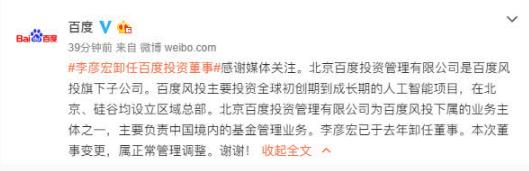 針對此次變更,百度回應稱(chēng):感謝媒體關(guān)注。北京百度投資管理有限公司是百度風(fēng)投旗下子公司。百度風(fēng)投主要投資全球初創(chuàng )期到成長(cháng)期的人工智能項目,在北京、硅谷均設立區域總部。北京百度投資管理有限公司為百度風(fēng)投下屬的業(yè)務(wù)主體之一,主要負責中國境內的基金管理業(yè)務(wù)。李彥宏已于去年卸任董事。本次董事變更,屬正常管理調整。謝謝!