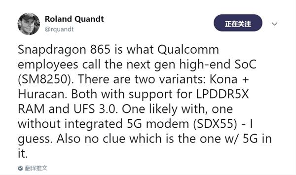 知名爆料人士 Roland Quandt 透露,高通驍龍 865 旗艦平臺內部代號是 SM8250,它將分為兩個(gè)不同的版本,其中一版代號為 Kona,另一版代號為 Huracan,它們都將支持 LPDDR5X 內存及 UFS 3.0 閃存,二者區別在于一款集成了高通驍龍 5G 調制解調器,另一款則沒(méi)有。