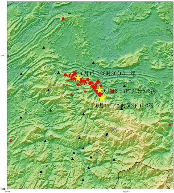 2019 年 6 月 17 日四川長(cháng)寧 6.0 級地震序列分布圖(其中三角位觀(guān)測臺站、園和五角星為地震)