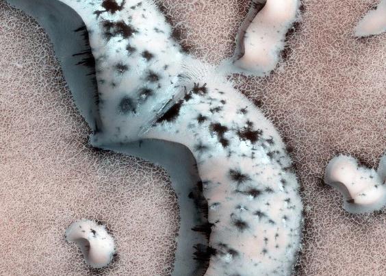 火星上的冰蓋是由水冰和凍結的二氧化碳結合而成的,這與地球上由水冰構成的冰蓋是不一樣的。與氣態(tài)的二氧化碳一樣,凍結的二氧化碳在讓陽(yáng)光穿透時(shí)也會(huì )將熱量困住。在夏天,這種固態(tài)的溫室效應會(huì )在冰層下導致小范圍的升溫。