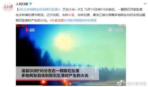 2019年10月11日0點(diǎn)左右,疑似一顆隕石墜落,多位吉林網(wǎng)友目擊到其墜落時(shí)產(chǎn)生的火花,黑夜映照成白天一樣。