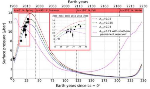 此外,掩星觀(guān)測結果限制了模型中的下層土熱慣量,解釋了從到達近日點(diǎn)(1989 年)至今,30 年來(lái)仍然可以觀(guān)測到的氣壓增長(cháng)相移。下層土先是將熱量?jì)Υ嫫饋?lái),然后逐漸釋放,這一過(guò)程還在進(jìn)行之中。掩星觀(guān)測結果還限制了由氮冰反射回太空的太陽(yáng)能比例(球面反照率),以及氮冰本身的輻射率。