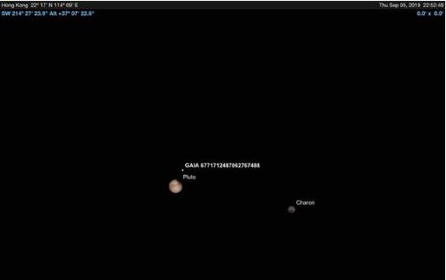 冥王星和 GAIA DR2 6771712487062767488 恒星,右側為冥衛一“卡戎”(Charon)