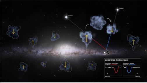 這張圖顯示了氣體在銀河系中上升和下落的過(guò)程。利用哈勃的宇宙起源頻譜儀 10 年的數據,天文學(xué)家發(fā)現,進(jìn)入銀河系的氣體多于離開(kāi)銀河系的氣體。
