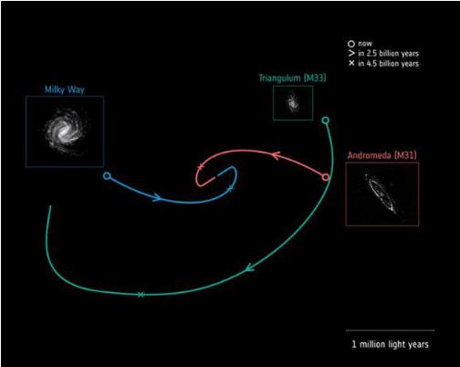 未來(lái)三個(gè)螺旋星系的軌道軌跡:藍色為銀河系;紅色為仙女座星系,也被稱(chēng)為 M31;綠色為三角座星系,也被稱(chēng)為 M33。一項基于歐洲蓋亞任務(wù)觀(guān)測數據的研究表明,銀河系和仙女座星系將在 45 億年后發(fā)生碰撞。