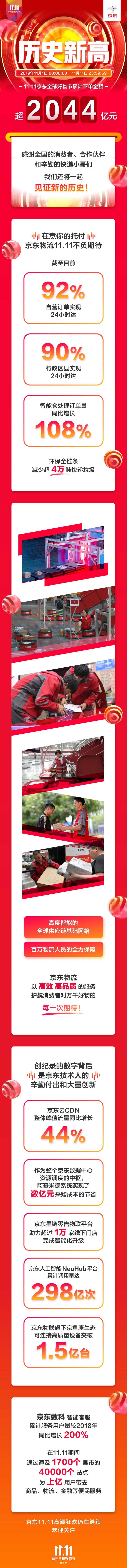 11 月 12 日消息,據京東官方消息,從 11 月 1 日零時(shí)起至 11 月 11 日 23 時(shí) 59 分 59 秒,“11.11 京東全球好物節”累計下單金額超 2044 億元,較 2018 年 11.11 實(shí)現大幅超越。