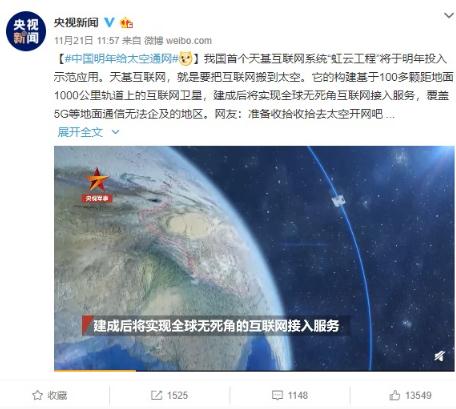 央視新聞近日報道,我國首個(gè)天基互聯(lián)網(wǎng)系統「虹云工程」將于 2020 年投入示范應用。