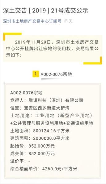 11 月 29 日,深圳土地房產(chǎn)交易中心公眾號稱(chēng)騰訊以 85.2 億元掛牌價(jià)成功競得大鏟灣 A002-0076 宗地。當然,騰訊買(mǎi)島不是網(wǎng)友們調侃的養鵝。