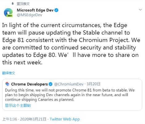 微軟在今日置頂的推特表示,考慮到當前形勢,Edge 團隊將與 Chromium 項目的開(kāi)發(fā)節奏保持一致,暫停將穩定通道更新至 Edge 81。當然這并不代表團隊會(huì )暫停 Microsoft Edge 的開(kāi)發(fā),他們仍會(huì )致力于對 Edge 80 進(jìn)行持續的安全性和穩定性更新。更多信息請等待下周分享。