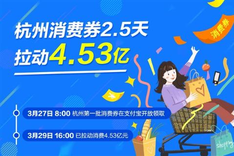 3 月 27 日 8 時(shí),杭州第一批消費券在支付寶開(kāi)放領(lǐng)取。截至 29 日 16 時(shí),僅僅兩天半時(shí)間,就已拉動(dòng)消費 4.53 億元。
