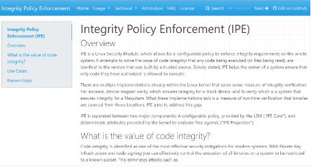 IPE 是微軟為解決 Linux 的代碼完整性問(wèn)題而進(jìn)行的嘗試。分為兩個(gè)主要部分:由 LSM 提供的可配置策略(“IPE Core”),以及由內核提供的用于評估文件的確定性屬性(“IPE Properties”)。目前,IPE 尚處于 RFC(request for comments)狀態(tài)。