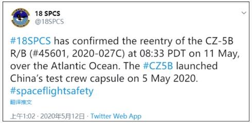 有著(zhù)“第六軍隊”之稱(chēng)的美國太空部隊在推特上表示,中國長(cháng)征五號B火箭芯一級在完成任務(wù)后于 5 月 11 日在大西洋上空脫離軌道,于北京時(shí)間昨晚 23 時(shí) 33 分左右再入靠近非洲西海岸的大西洋海域。芯一級繞行地球達 102 圈。