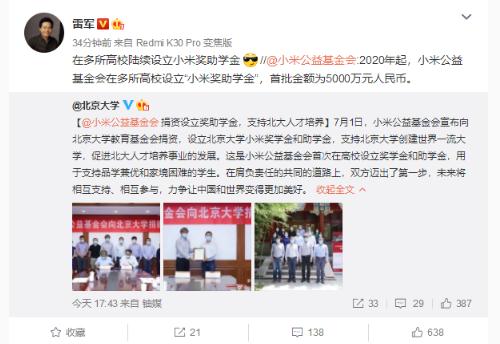 7 月 1 日,小米公益基金會(huì )宣布向北京大學(xué)教育基金會(huì )捐資,設立北京大學(xué)小米獎學(xué)金和助學(xué)金,支持北京大學(xué)創(chuàng )建世界一流大學(xué),促進(jìn)北大人才培養事業(yè)的發(fā)展。