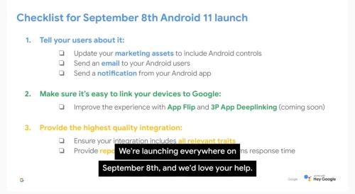 與此同時(shí),一些外媒發(fā)現,在最近舉行的一個(gè)名為“Hey Google”的智能家居峰會(huì )上,一張幻燈片泄露了 Android 11 正式版的發(fā)布日期。該公司在視頻第 18 分鐘的時(shí)間處展示了一張名為 "9 月 8 日 Android 11 發(fā)布會(huì )的檢查表 "的幻燈片。