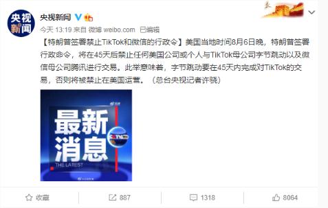據央視報道,當地時(shí)間 8 月 6 日,美國宣布將在 45 天后禁止任何美國公司或個(gè)人與 TikTok 母公司字節跳動(dòng)以及微信母公司騰訊進(jìn)行交易。