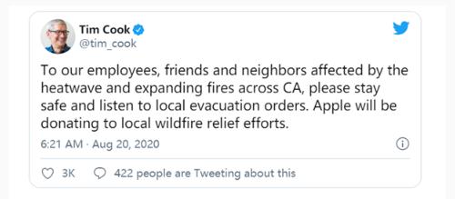 蘋(píng)果 CEO 庫克日前宣布,蘋(píng)果公司計劃捐款。以幫助加州的山火救濟工作。