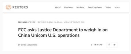 路透社:美國聯(lián)邦通信委員會(huì )要求美司法部介入中國聯(lián)通在美業(yè)務(wù)