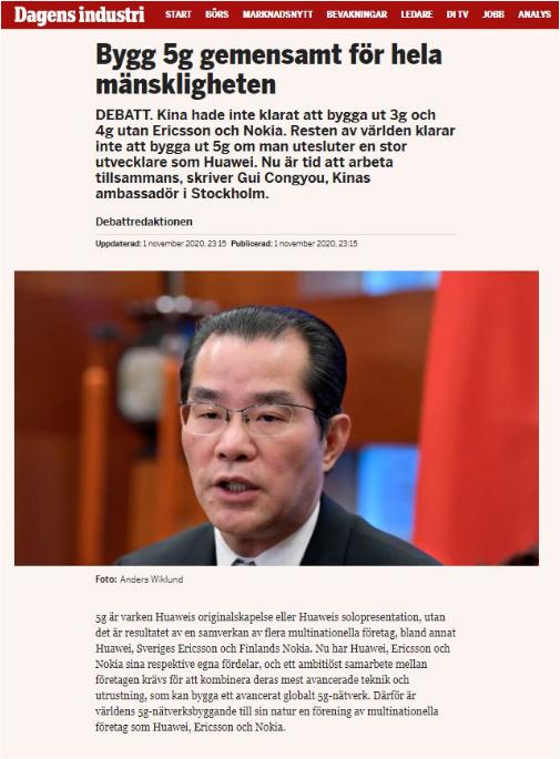 據中國駐瑞典大使館網(wǎng)站 11 月 2 日晚消息,11 月 1 日,桂從友大使在瑞典《今日工業(yè)報》發(fā)表題為《合作建 5G 造福全人類(lèi)》的署名文章。全文如下: