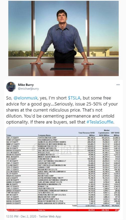 12 月 2 日消息,《大空頭》原型 Micheal Burry 今日在社交平臺上發(fā)布推文并@特斯拉 CEO 馬斯克(Elon Musk),表示自己正在做空特斯拉(TSLA.US)。此前,Micheal Burry 認為特斯拉的估值與業(yè)內其他公司相比是荒謬的,他發(fā)布了一張截圖,顯示了特斯拉與其競爭對手的估值。