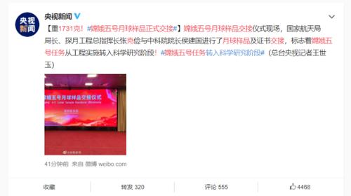 據央視報道,嫦娥五號月球樣品交接儀式現場(chǎng),國家航天局局長(cháng)、探月工程總指揮長(cháng)張克儉與中科院院長(cháng)侯建國進(jìn)行了月球樣品及證書(shū)交接,標志著(zhù)嫦娥五號任務(wù)從工程實(shí)施轉入科學(xué)研究階段。