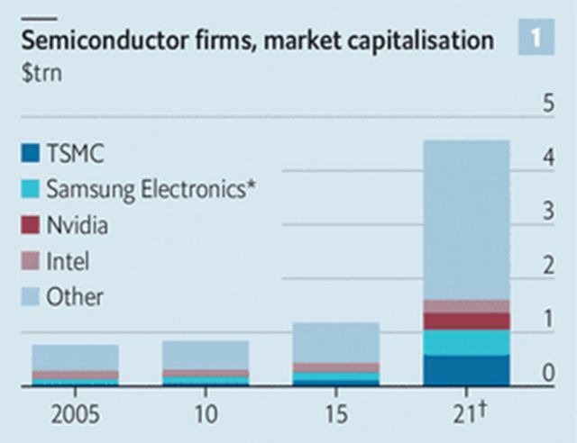 圖 1 膨脹的全球半導體產(chǎn)業(yè)市值。截圖自《經(jīng)濟學(xué)人》,數據來(lái)源:彭博社;麥肯錫咨詢(xún)公司;經(jīng)濟學(xué)人(下同)