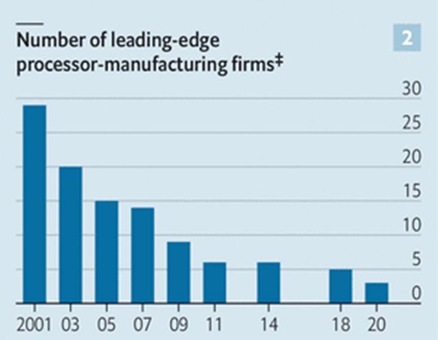 進(jìn)入千禧之年,一家尖端工廠(chǎng)可能要花費 10 億美元。管理咨詢(xún)公司麥肯錫(McKinsey) 2011 年的一份報告指出,一家先進(jìn)晶圓廠(chǎng)的通常成本為 30-40 億美元。最近,臺積電 2020 年在臺灣南部建成的 3 納米制程工廠(chǎng)耗資 195 億美元。臺積電已經(jīng)在考慮 2 納米芯片,其耗費的投資肯定會(huì )更高。英特爾的步履蹣跚使其被孤立在 10nm 業(yè)務(wù)之中,其老板鮑勃·斯旺(Bob Swan)也因此丟了工作,其繼任者帕特·格爾辛格(Pat Gelsinger)將需要決定公司是否要繼續生產(chǎn)芯片。與臺積電不同,英特爾也設計自己的芯片。潛在的新入圍者面臨著(zhù)超高的門(mén)檻。每有一項技術(shù)進(jìn)步,晶圓廠(chǎng)的經(jīng)濟效益就會(huì )將入圍門(mén)檻推得更高。