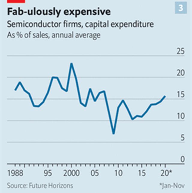 圖 3 芯片行業(yè)資本支出在下降過(guò)后,再度開(kāi)始回升。截圖自《經(jīng)濟學(xué)人》數據來(lái)源:Future Horizons