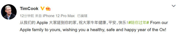 2月12日消息,蘋(píng)果CEO庫克通過(guò)微博送出新春祝福,他寫(xiě)到“祝大家牛年健康,平安快樂(lè )”。