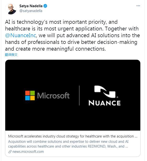 據路透社報道,當地時(shí)間4月12日,美國科技公司微軟和人工智能及語(yǔ)音技術(shù)公司紐安斯共同發(fā)布公告稱(chēng),雙方已達成最終協(xié)議,微軟將以每股56美元、197億美元(包含債務(wù))的現金交易價(jià)值收購紐安斯,以拓展針對醫療保健客戶(hù)的云解決方案。這個(gè)價(jià)格讓紐安斯正式成為微軟史上第二大收購案。