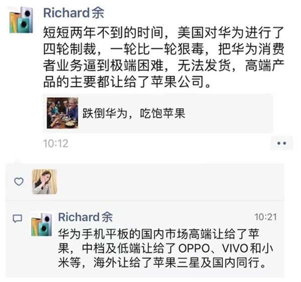 4月30日,余承東在朋友圈分享了虎嗅標題為《跌倒華為,吃飽蘋(píng)果》的文章,并附言痛斥美國對于華為的制裁和打壓,讓蘋(píng)果坐收漁利。