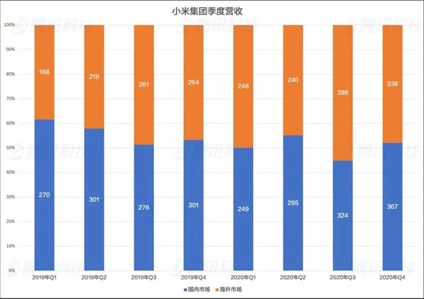 2020年第三季度,小米迎來(lái)了歷史上最好的一季財報,海外市場(chǎng)的營(yíng)收大幅度增長(cháng),首次超越了國內市場(chǎng),盡管到了Q4有所下滑,但整體的營(yíng)收也要比之前提升了30%左右。