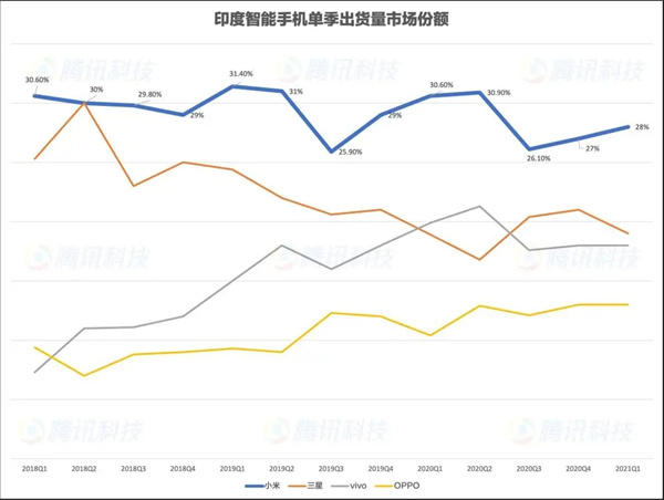 小米智能手機市場(chǎng)份額的穩步提升,歐洲市場(chǎng)貢獻頗多,而另外一個(gè)海外市場(chǎng)也不容忽視,那就是如今飽受疫情困擾的印度。