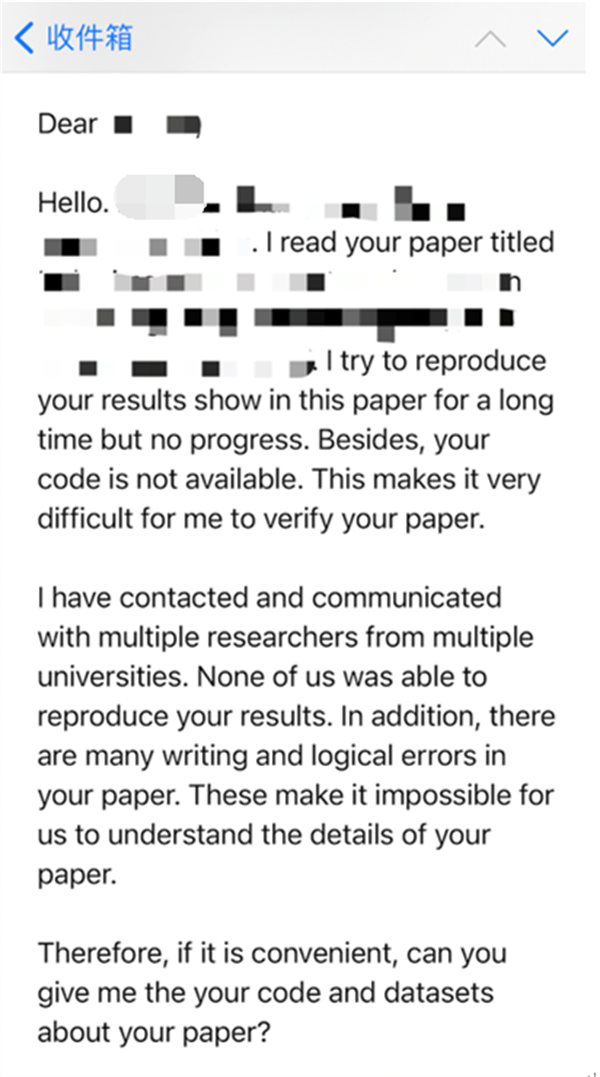 匿名要的,因為擔心作者舉報,通常不會(huì )用實(shí)際單位郵箱而用社會(huì )上的通用郵箱發(fā)送。這些匿名郵件不會(huì )表露出要代碼或者要實(shí)現細節的目的和用途,而是在言辭上拐彎抹角地逼問(wèn)恐嚇,例如指責疑點(diǎn)很多、將舉報論文作者等等??梢坏┳髡邔⒋a或者實(shí)現細節回復匿名者,并詢(xún)問(wèn)對方發(fā)現的具體疑點(diǎn)后,往往就沒(méi)有下文了。