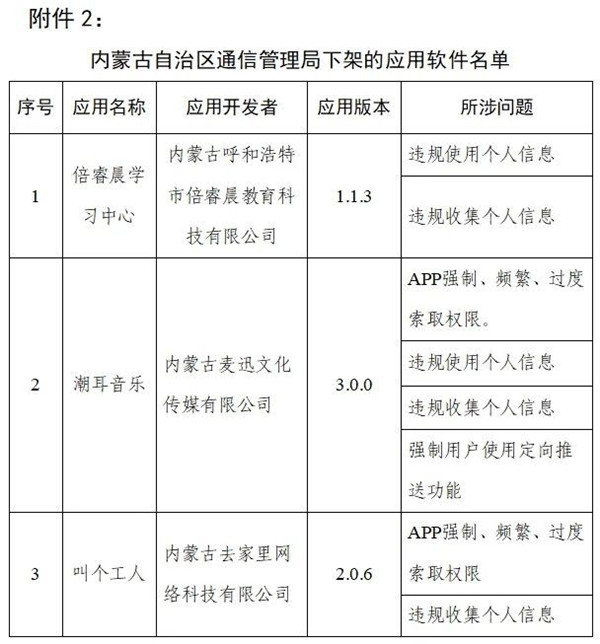 2、內蒙古自治區通信管理局下架的應用軟件名單