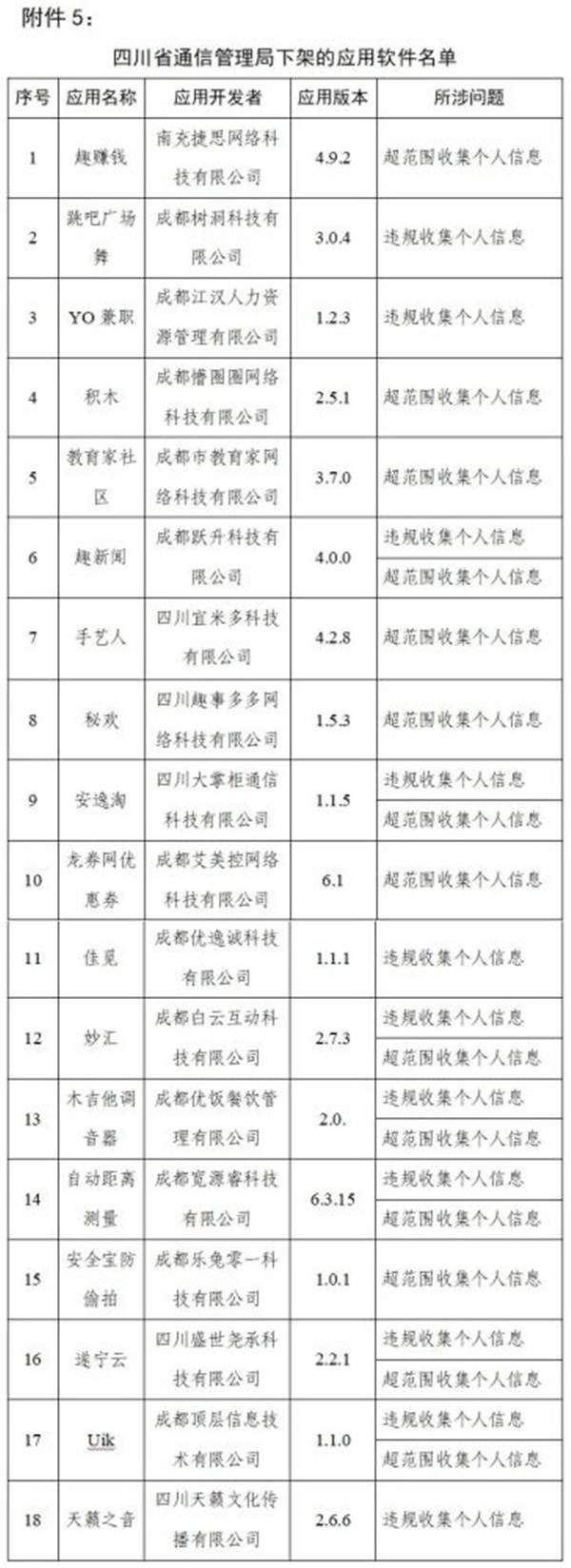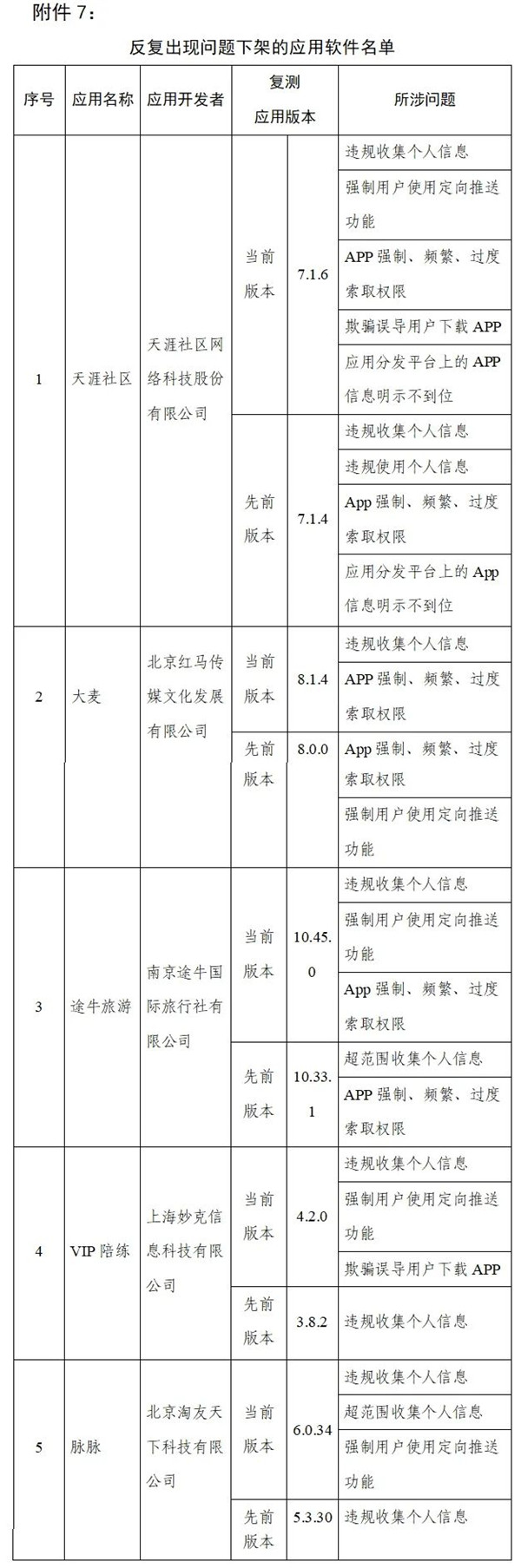 此外,在近期檢測中,我部發(fā)現天涯社區、大麥、途牛旅游、VIP陪練、脈脈5家企業(yè)在A(yíng)PP不同版本中反復出現同類(lèi)問(wèn)題(詳見(jiàn)附件7),我部將依法暫停其違規行為,予以直接下架處理。